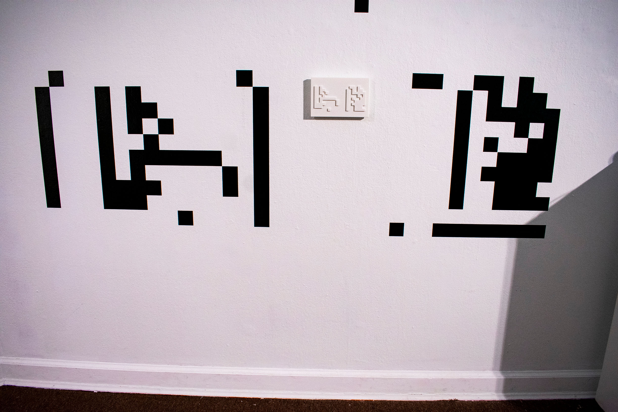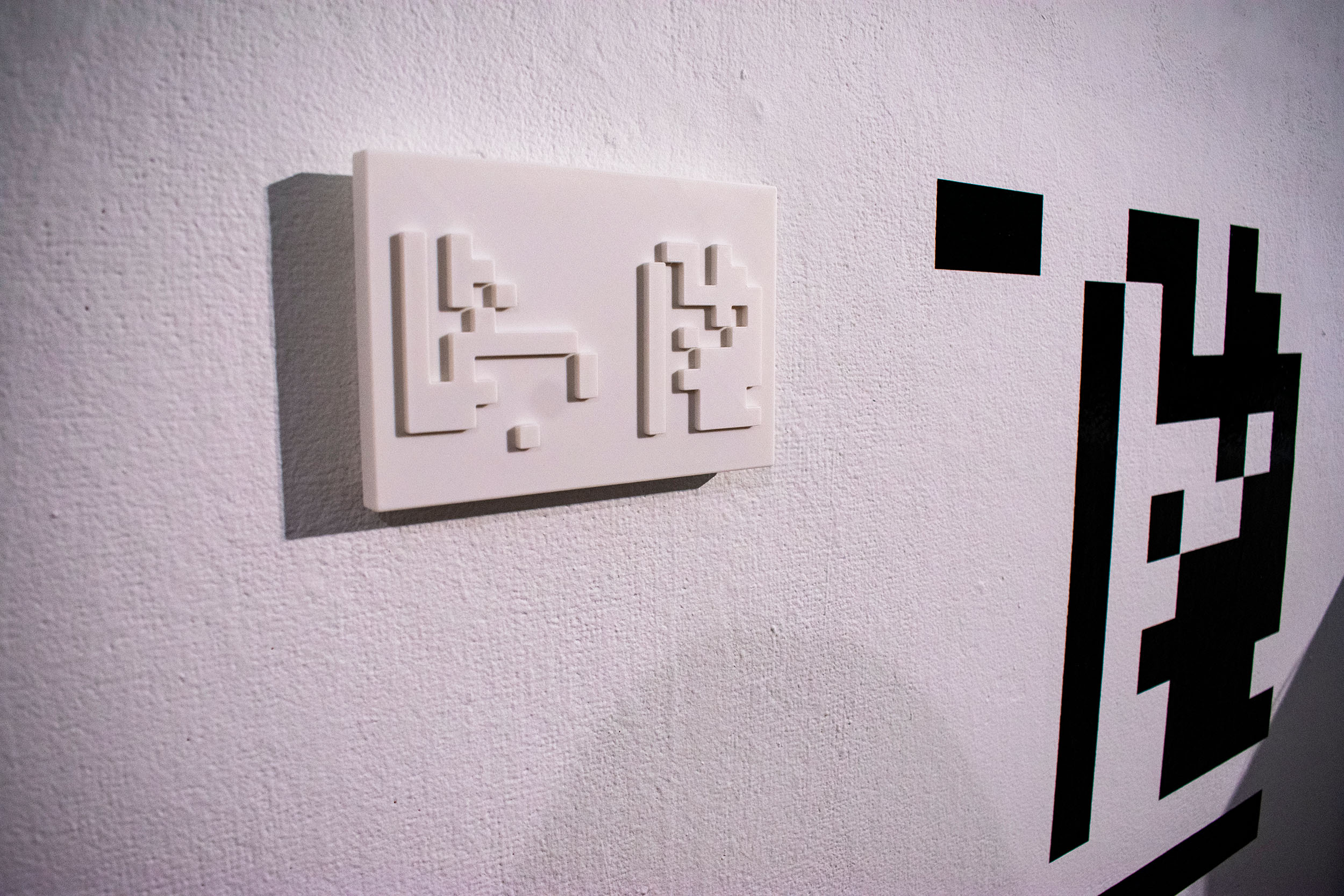 The white, smooth tactile sculpture is a small version of the vinyl cutouts set in relief. It’s square blocks follow the images on the vinyl exactly.